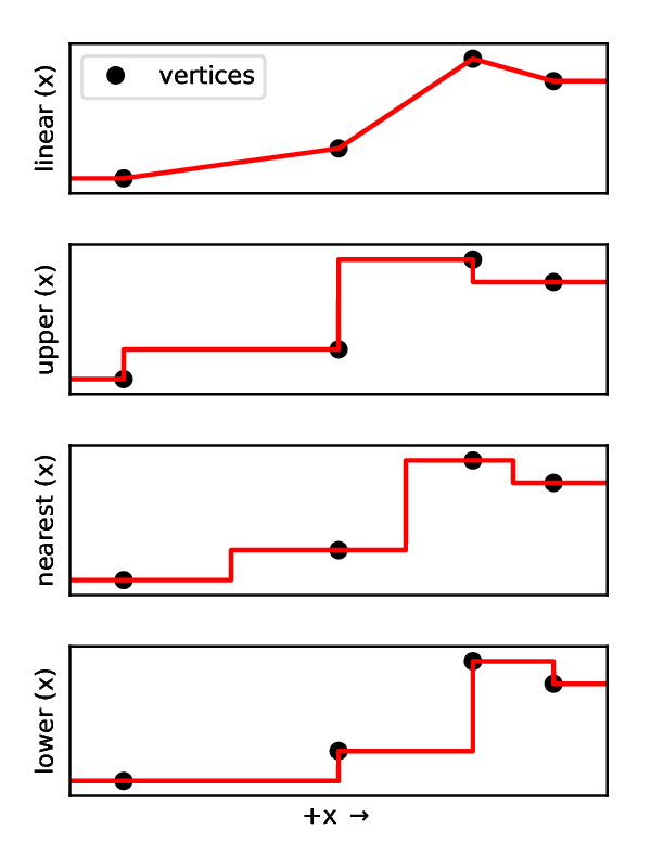Outside of the table axes, these functions will return the edge-values. The following figure illustrates how each of these methods work along a single dimension, given identical table values:
