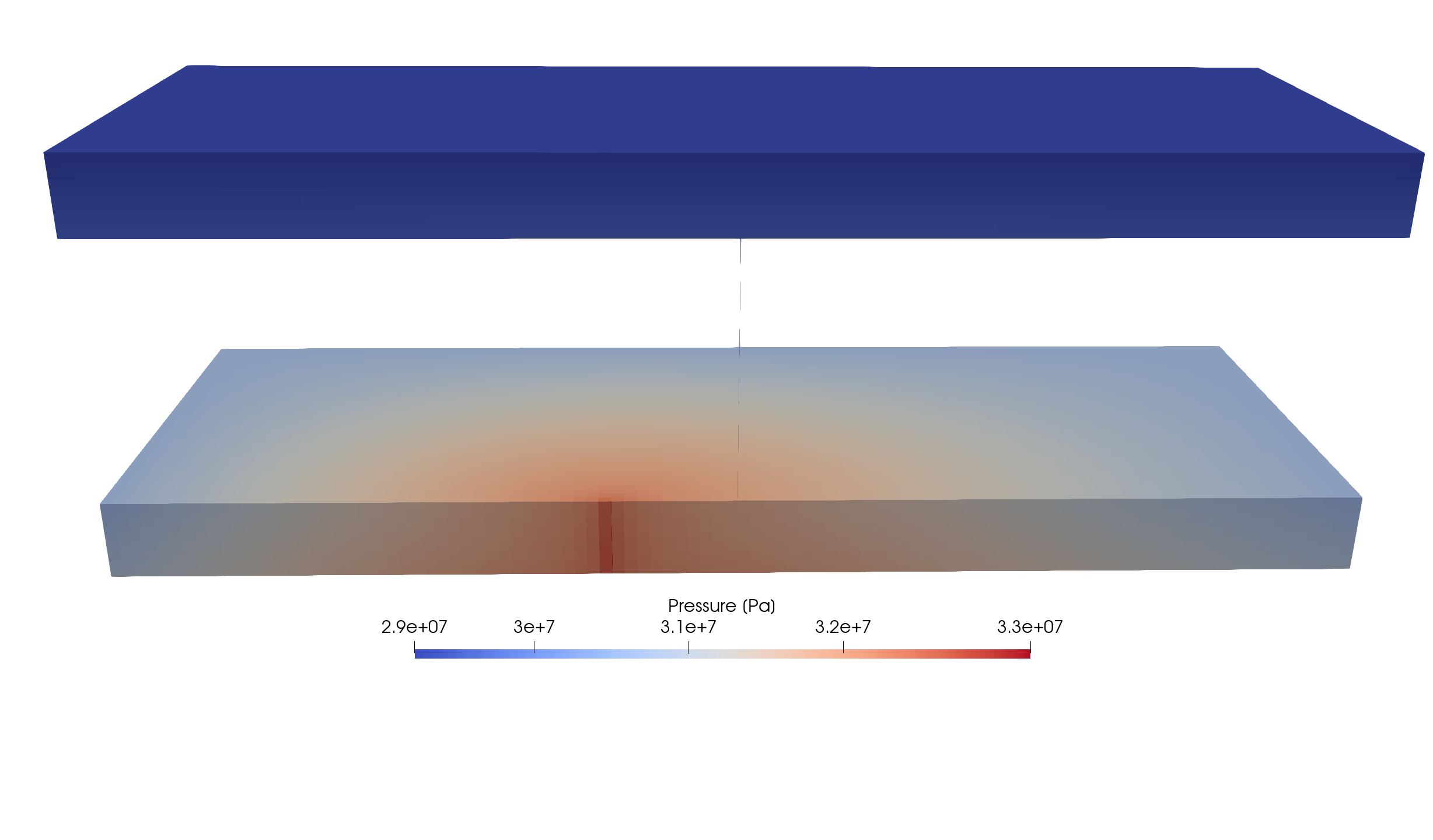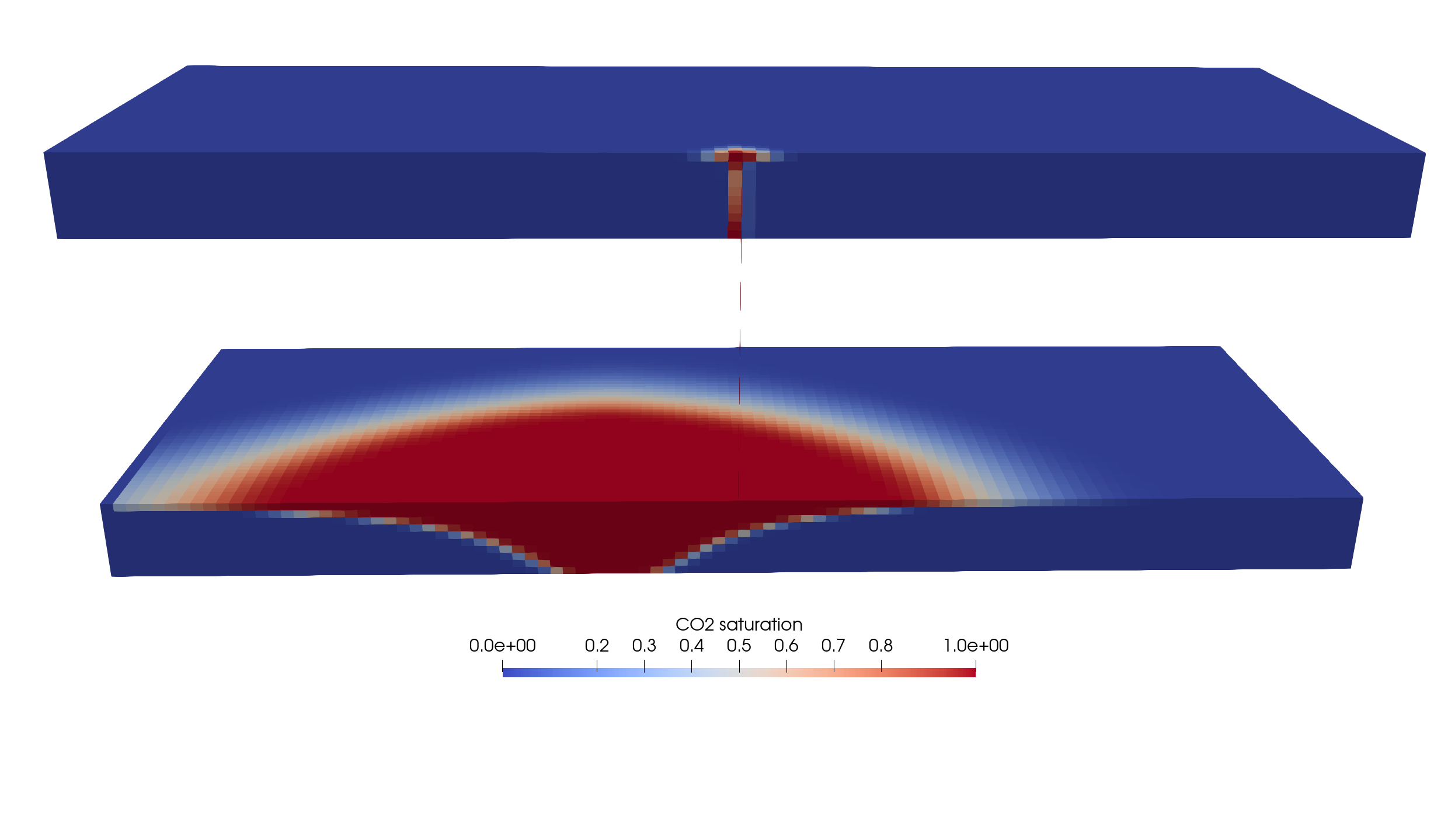 We use the targetRegions attribute to define the regions where the flow solver is applied. Here, we follow the approach described in (Class et al., 2009) and do not simulate flow in the aquitard, considered as impermeable to flow. We only simulate flow in the two aquifers (aquiferTop and aquiferBottom), in the bottom part of the injection well (injectionWell), and in the leaky well connecting the two aquifers (leakyWell).