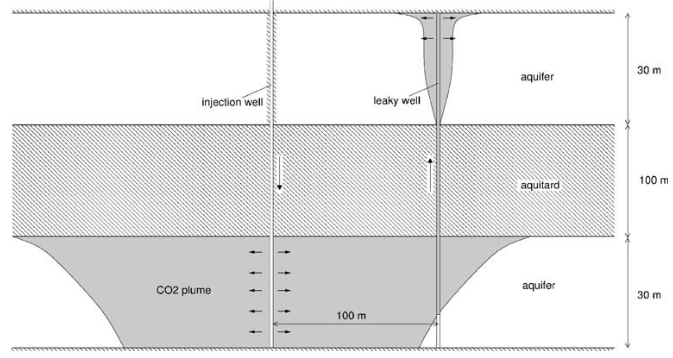 The leakage scenario considered here involves one CO2 injection well, one leaky well, two aquifers and an aquitard. The setup is illustrated in the figure below. The leaky well connects the two aquifers. CO2 is injected into in the lower aquifer, comes in contact with the leaky well and rises to the higher aquifer. The advective flow (including the buoyancy effects) of CO2 in the initially brine-saturated aquifers and through the leaky well is the most important process in this problem.