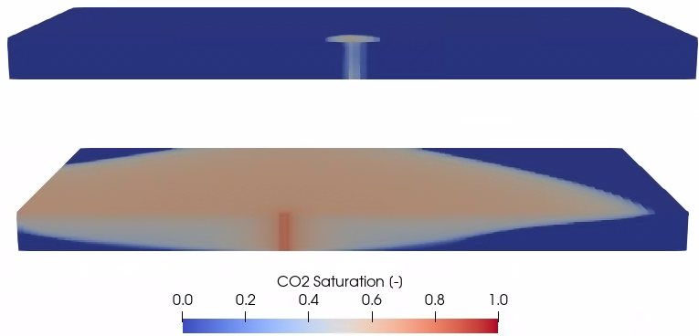 This validation case is a more complex version of the benchmark problem presented in CO2 Plume Evolution and Leakage Through an Abandoned Well. While the latter is based on simple isothermal and immiscible fluid properties, the present validation case relies on a more realistic fluid behavior accounting for thermal effects and mass exchange between phases. This non-isothermal benchmark test has been used in (Class et al., 2009) to compare different implementations of CO2-brine fluid properties in the context of CO2 injection and storage in saline aquifers.