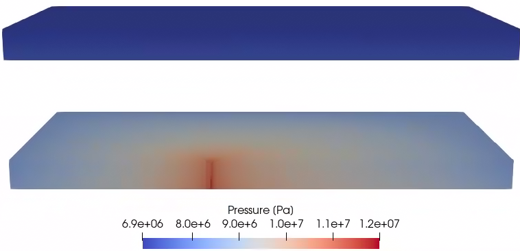 Although this is the same block as in CO2 Plume Evolution and Leakage Through an Abandoned Well, GEOS is now enforcing the geothermal gradient specified in the TableFunction named initTempTable, and is also accounting for the nonlinear temperature dependence of brine density to equilibrate the pressure field.
