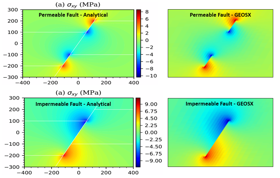 The figure below compares the results from GEOS (marks) and the corresponding analytical solution (solid curves) for the change of total stresses (\sigma_{xx}, \sigma_{yy} and \sigma_{xy}) along the fault plane. As shown, GEOS reliably captures the mechanical deformation of the faulted reservoir and shows excellent agreement with the analytical solutions for two different scenarios. Differences in the stress perturbations between the cases with permeable and impermeable fault are also noticeable, which suggests that fault permeability plays a crucial role in governing reservoir deformation for the problems with reservoir pressurization or depletion.
