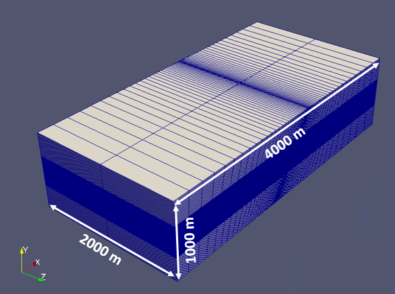 Here, we load the mesh with VTKMesh. The syntax to import external meshes is simple: in the XML file, the mesh file faultMesh.vtu is included with its relative or absolute path to the location of the GEOS XML file and a user-specified label (here FaultModel) is given to the mesh object. This mesh contains quadrilateral elements and local refinement to conform with the fault geometry, and two reservoir compartments displaced by the fault. The size of the reservoir should be large enough to avoid boundary effects.