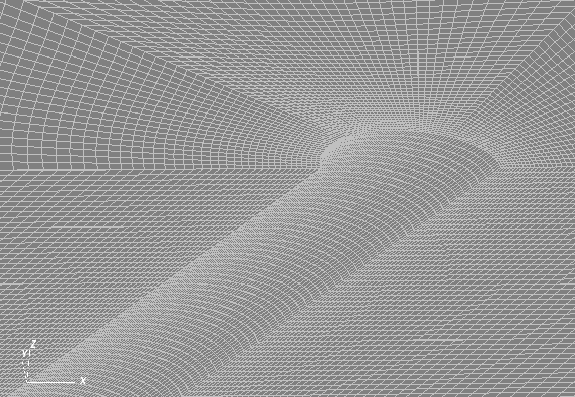 The internal wellbore mesh generator InternalWellbore is employed to create the mesh of this wellbore problem. The radius of the wellbore and the size of the surrounding rock formation are defined by a vector radius. In the tangent direction, theta angle is specified from 0 to 180 degree for a half of the domain regarding its symmetry. Note that the whole domain could be specified with a theta angle from 0 to 360 degree, if modeling complicated scenarios. The trajectory of the well is defined by trajectory. In this example, the wellbore is inclined in the x-z plane by an angle of 45 degree. The autoSpaceRadialElems parameter allows optimally increasing the element size from local zone around the wellbore to the far-field zone, which is set to 1 to activate this option. The useCartesianOuterBoundary transforms the far-field boundary to a squared shape to enforce a Cartesian aligned outer boundary, which eases the loading of the far-field boundary conditions. In this example, this value is set to 0 for the single region along the radial direction.