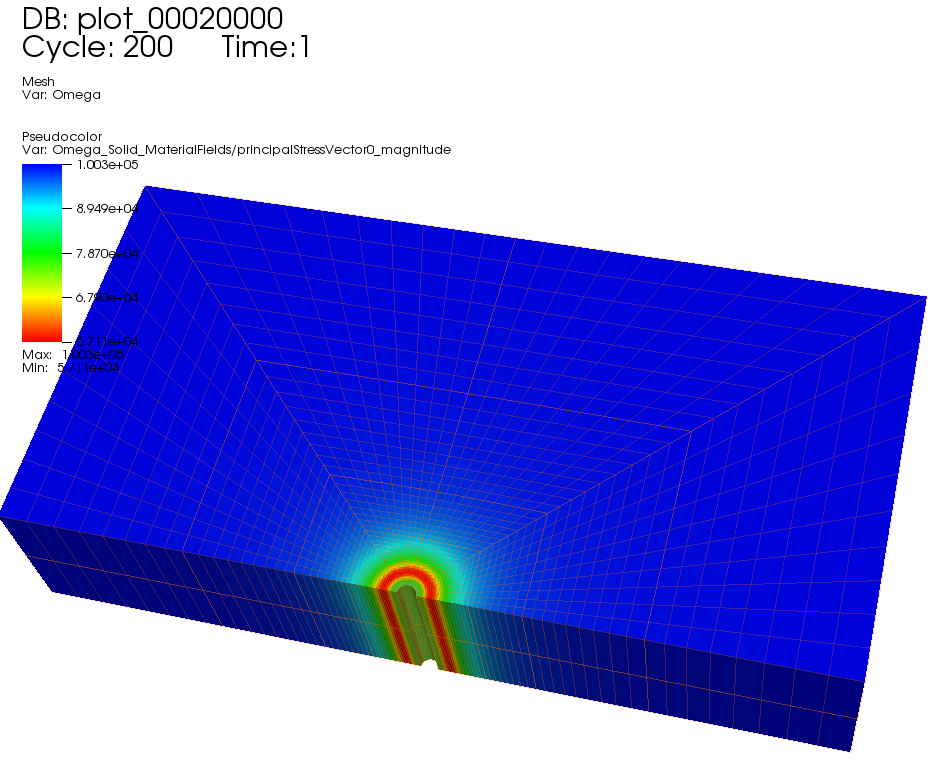 In the above example, we requested silo-format output files. We can therefore import these into VisIt and use python scripts to visualize the outcome. The following figure shows the distribution of \sigma_{\theta\theta} in the near wellbore region.