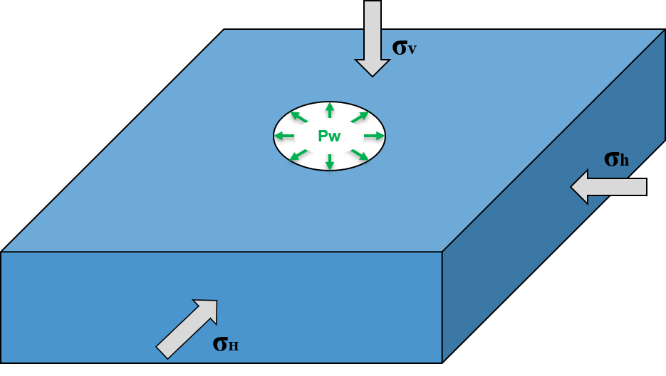 We simulate a drained wellbore problem subjected to isotropic horizontal stress (\sigma_h) and vertical stress (\sigma_v), as shown below. By increasing the wellbore supporting pressure (P_w), the wellbore expands, and the formation rock experiences elastoplastic deformation. A plastic zone develops in the near wellbore region.