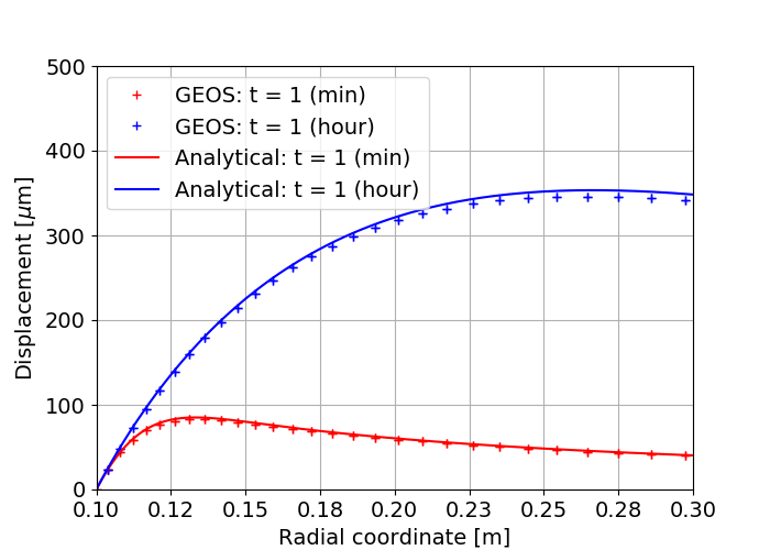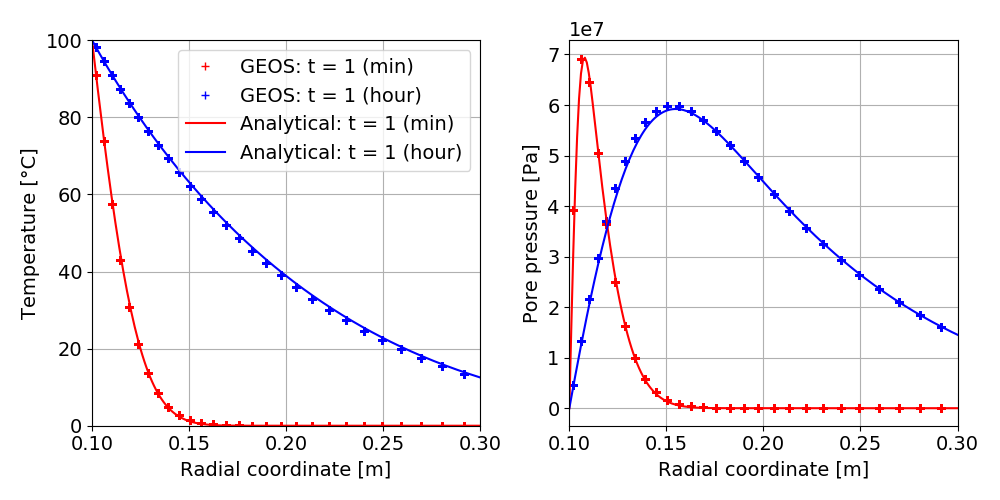 A good agreement between the GEOS results and analytical results for temperature and pore pressure distribution around the wellbore is shown in the figures below: