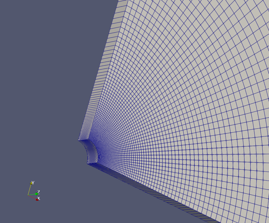 The internal wellbore mesh generator InternalWellbore is employed to create the mesh of this wellbore problem. The radii of the open wellbore and the far-field boundary of the surrounding rock formation are defined by a vector radius. In the tangent direction, theta angle is specified from 0 to 90 degrees to simulate the problem on a quarter of the wellbore geometry. The problem is under plane strain condition and therefore we only consider thermal diffusion along the radial direction within a single horizontal layer. The trajectory of the well is defined by trajectory, which is vertical in this case. The autoSpaceRadialElems parameters allow for optimally increasing the element size from the near wellbore zone to the far-field one.