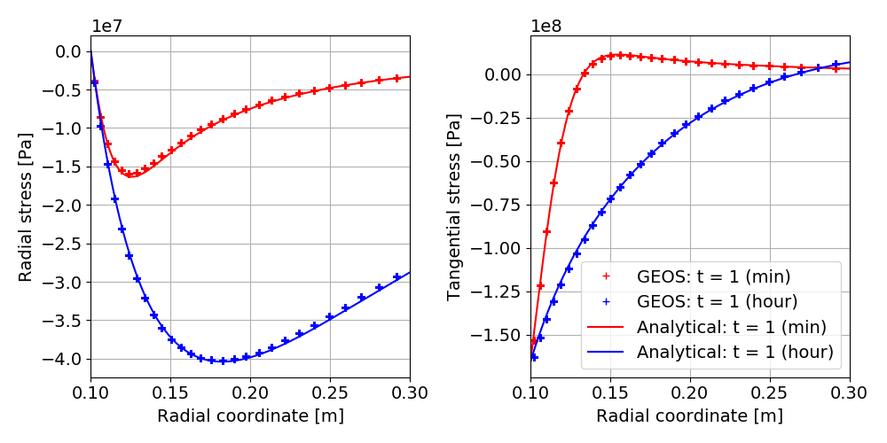 The validations of the total radial and hoop stress (tangent stress) components computed by GEOS against reference results are shown in the figure below: