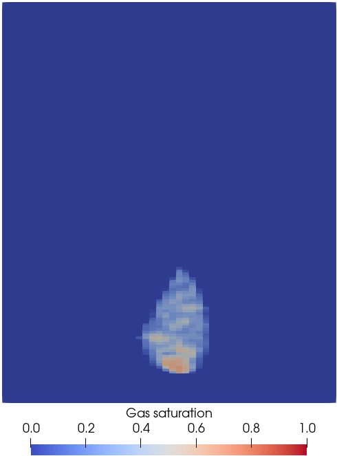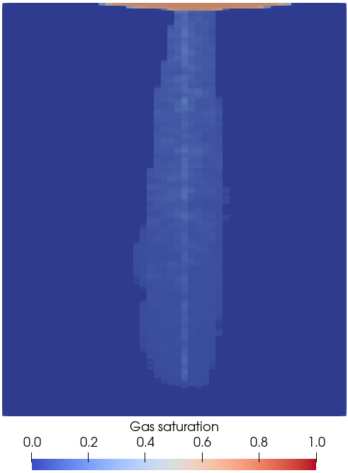 Using Paraview, we can observe the CO 2 plume moving upward under buoyancy effects and forming a gas cap at the top of the domain,