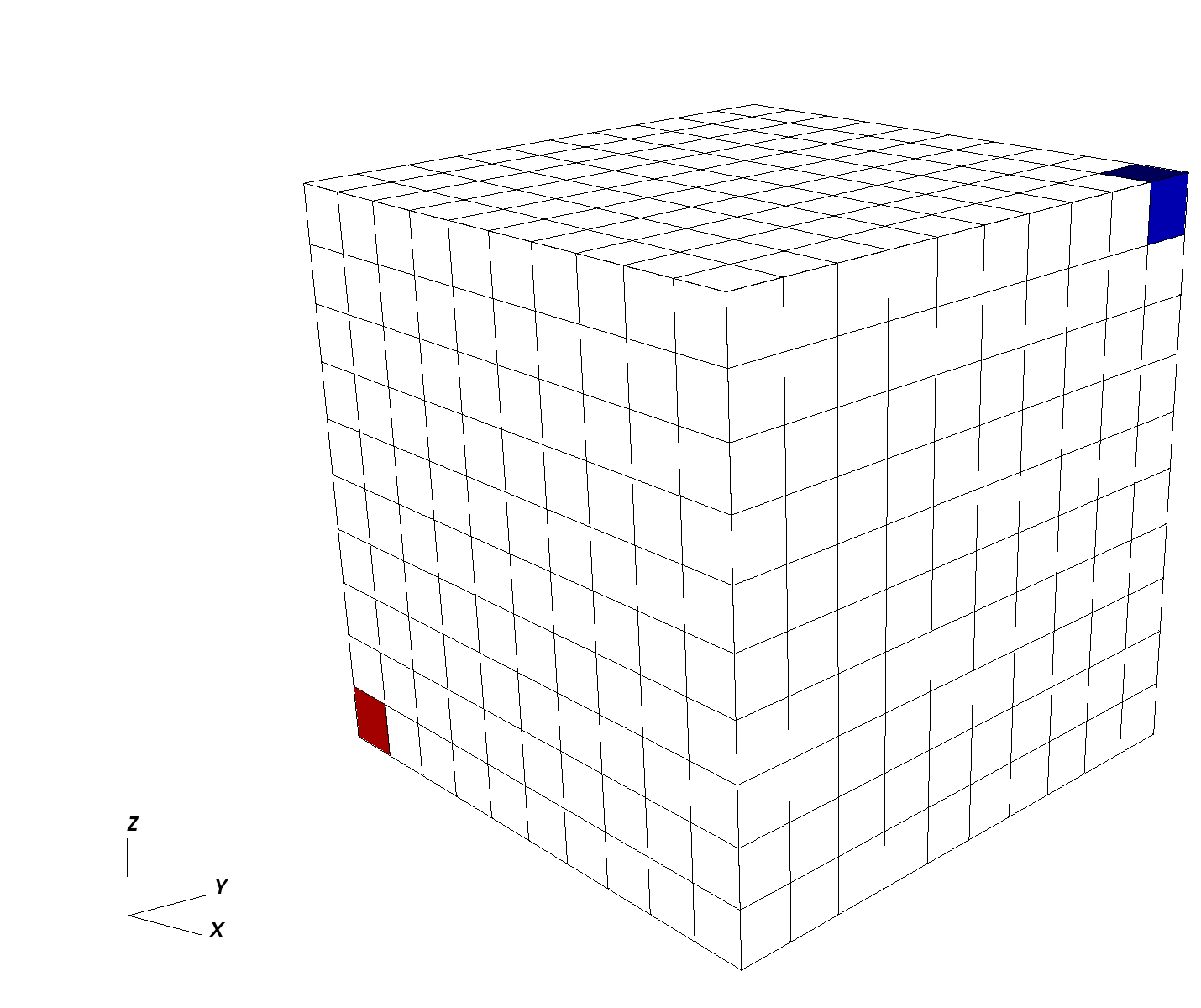 The pressure source is the element in the (0,0,0) corner of the domain, and the sink is the element in the (10,10,10) corner.